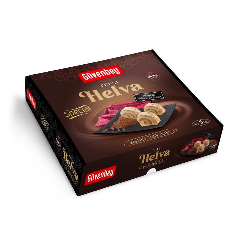 Güvenbey Cacao Sliced Tray Halva, which is your biggest helper in portion adjustment with its equal slices, is produced using 1st quality materials and traditional methods. Cocoa Tahini Halva, which does not contain any additives and glucose syrup, is made only by using Gypsophila Extract, which enables tahini, cocoa, sugar and sesame oil to mix with sugar. While we can offer a wide range of products including 350g, 400g, 600g and 800g, we offer you the facility you want with baklava slice, triangular slice, tray and block choices.