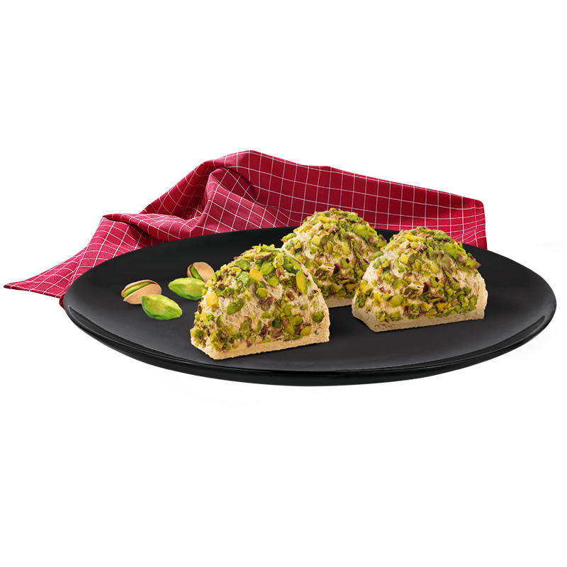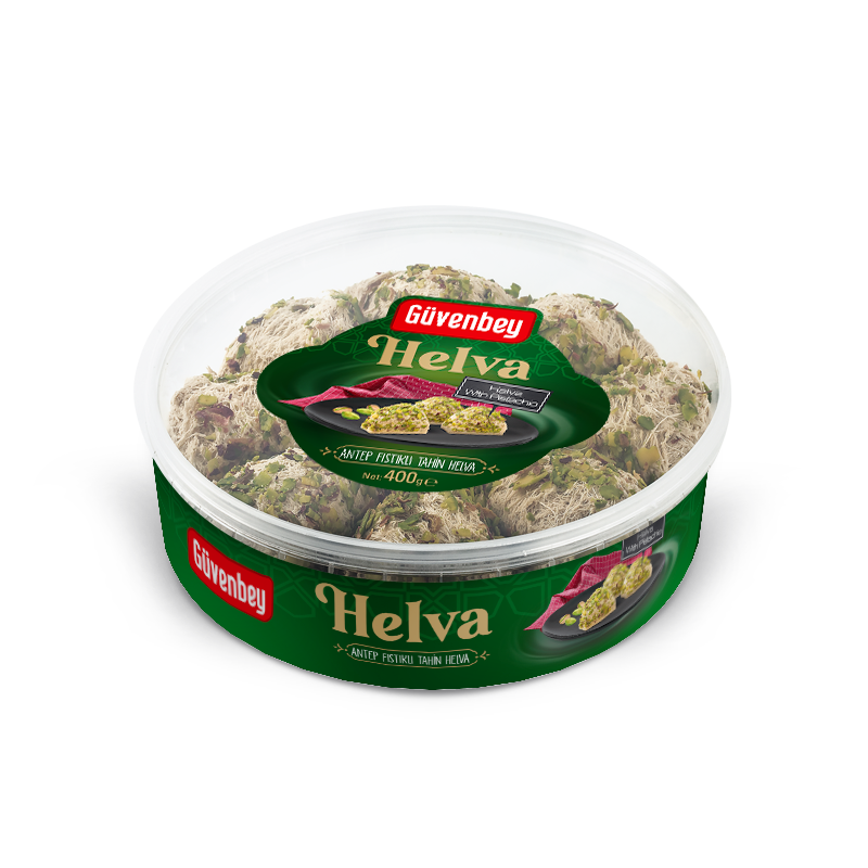 It is both practical and easy with delicious slice by slice! You can enjoy Güvenbey triangular sliced Pistachio Tahini Halva with its small size at every meal. It is made using only tahini, sugar and Gypsophila Extract, which allows sesame oil to mix with sugar. While we can offer a wide range of products including 350g, 600g, 800g and 5000g, we offer you the facility you want with baklava slice, triangular slice, tray and block choices.
