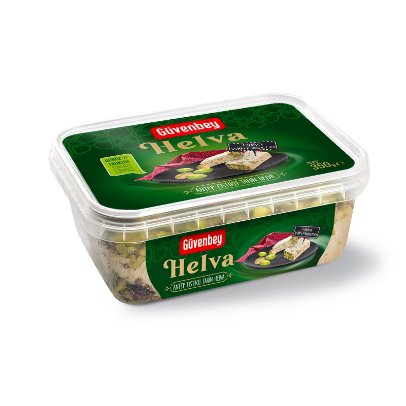 Bol bol Antep Fıstığı ile kahvaltılarınızın en sevilen lezzetlerinden Güvenbey Antep Fıstıklı Tahin Helva, kalite malzeme kullanılarak ve geleneksel yöntemler ile üretilmektedir. Sadece tahin, şeker ve susam yağının şeker ile karışmasını sağlayan Çöven Özütü kullanılarak yapılmaktadır. 400g, 600g, 800g ve 5000g olmak üzere geniş ürün yelpazesi sunabilirken, baklava dilim, üçgen dilim, tepsi ve blok seçenekleri ile size dilediğiniz kolaylığı sağlamaktadır.