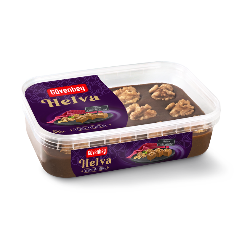 Bir dilimi ile gün boyu enerjinizi tazeleyen ve pratik boyu ile her an yanınıza alabileceğiniz Güvenbey Cevizli Yaz Helvası 1. kalite malzeme kullanılarak ve geleneksel yöntemler ile üretilmektedir. İçerisinde hiçbir katkı maddesi içermeyen Cevizli Yaz Helvası sadece ceviz tahin, şeker ve susam kullanılarak yapılmaktadır. 200g, 350g, 400g, 800g ve 5000g olmak üzere geniş ürün yelpazesi sunabilirken, baklava dilim, üçgen dilim, tepsi ve blok seçenekleri ile size dilediğiniz kolaylığı sağlamaktadır.